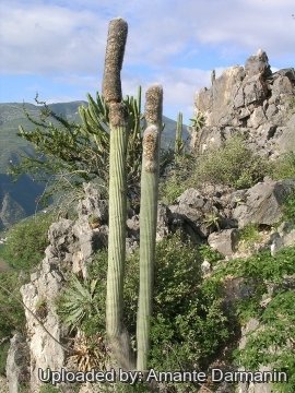 Cephalocereus genus is made of may species of columnar, slow-growing cacti, native from Mexico but widespread also in Brazil. The individual stems are usually unbranched. The flowers are whitish pink and inches (cm) long. The fruits are pinkish-re covered.